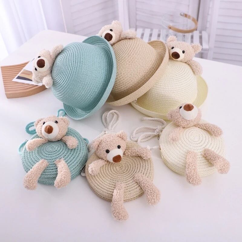 くまさんが可愛い麦わら帽子と麦わらバッグ